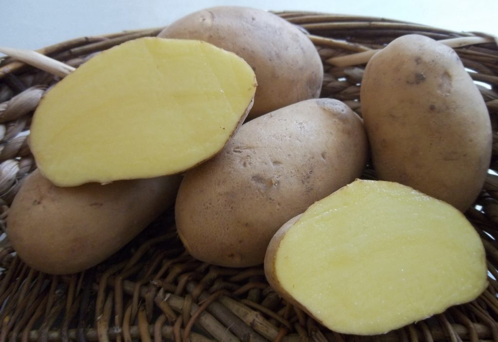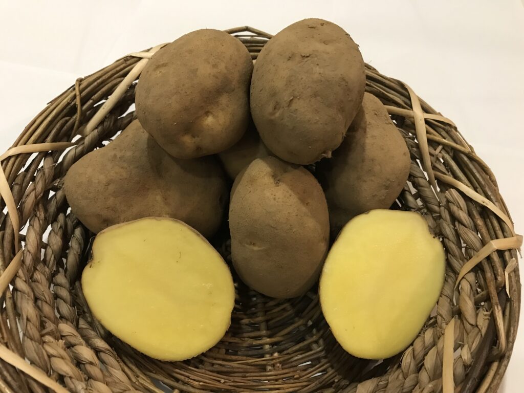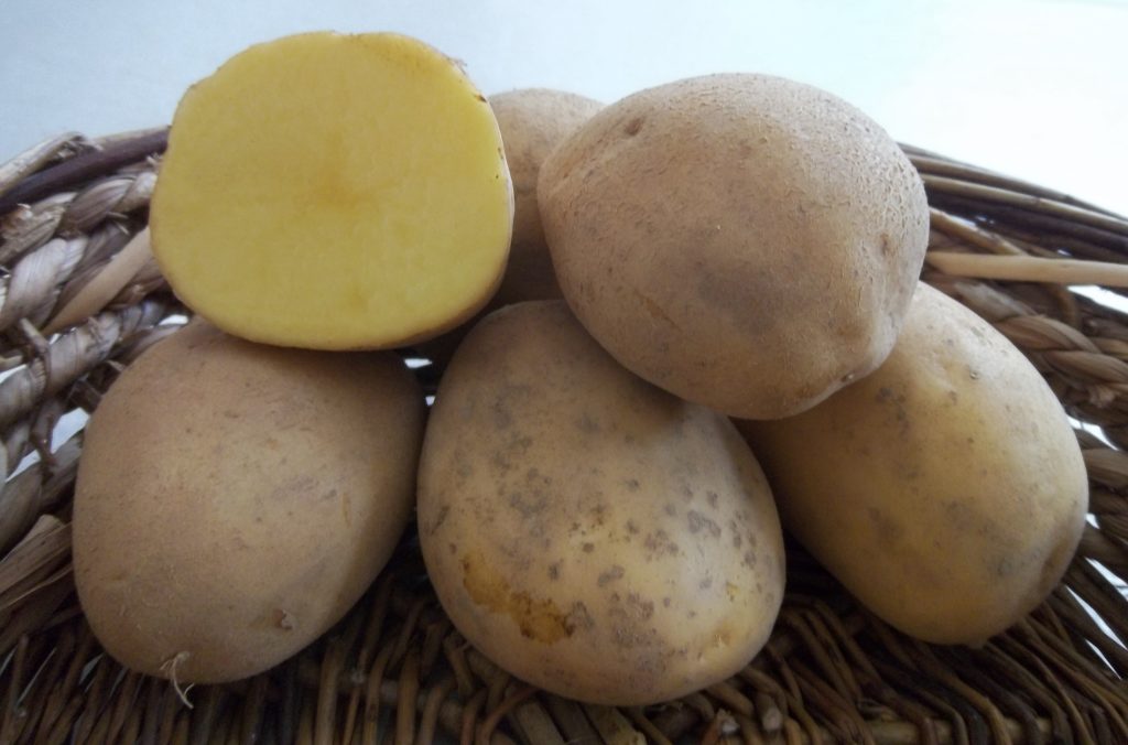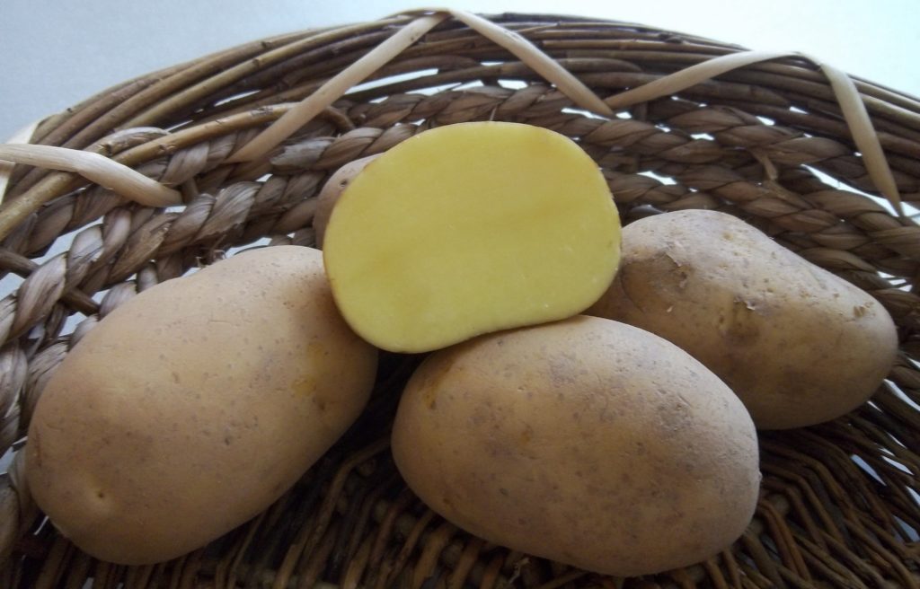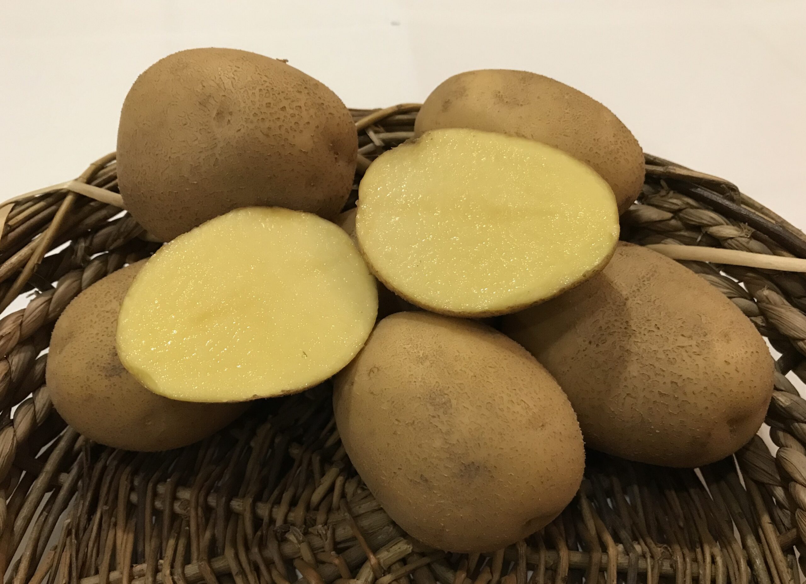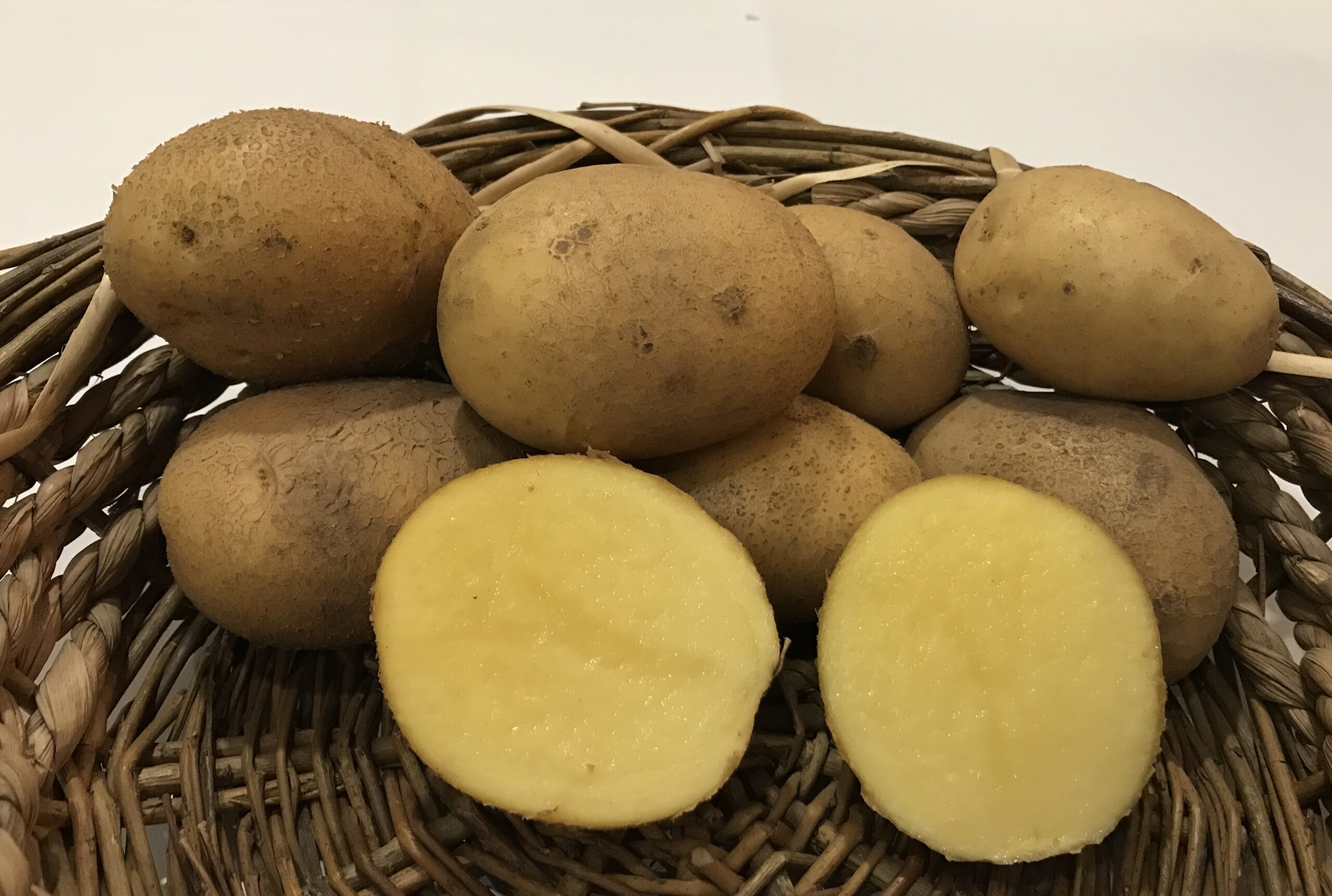 mehligkochende Sorte mit gelber Fleischfarbe, rundovalen Knollen und gutem Geschmack